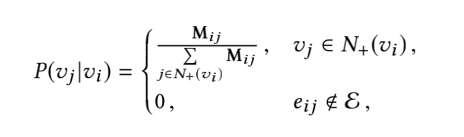 基于用户历史行为构图,得到一张带权有向图,入上图中的(b)所示,用\(\mathcal{G}=(\mathcal{V}, \mathscr{E})\)。\(M\)为图\(\mathcal{G}\)的邻接矩阵,其中\(M_{ij}\)表示图中节点i到节点j的边的权重。首先使用random walk的产出序列,如上图中的(c)所示。最后基于Skip-Gram算法学习每个节点的embedding表示。其中random walk时的转移概率的计算方式如下: